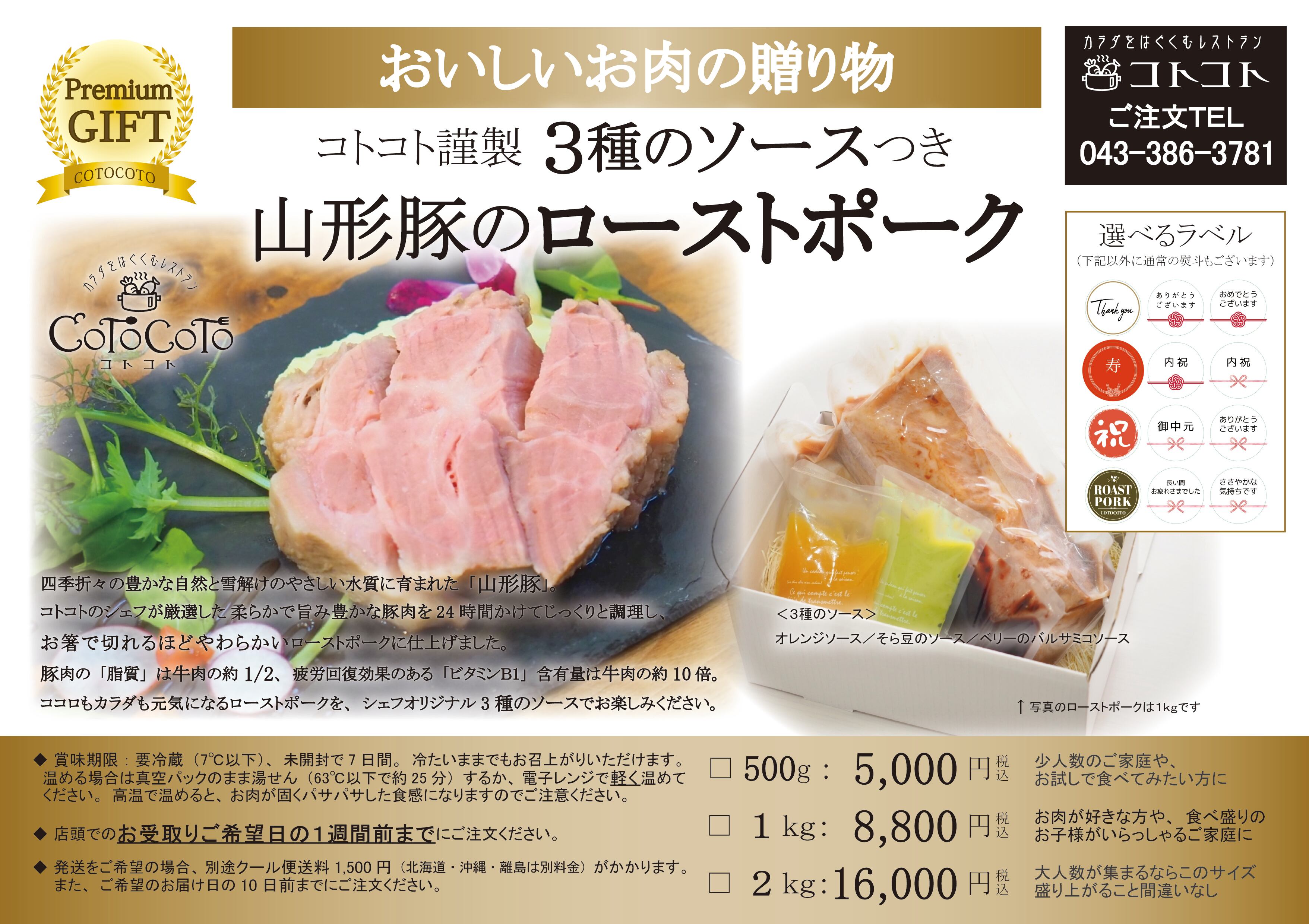 「コトコトの名物料理・しっとりやわらかな「ローストポーク」を、お友だちや親戚にも食べてもらいたい」というお客さまのお声から、「おいしいお肉の贈り物」としてギフト商品が登場しました。